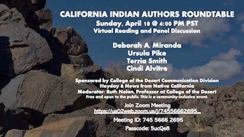 Ruth Nolan invites all to a California Indian Authors Roundtable reading and discussion on Sunday, April 18, 2021, 4 pm California time on Zoom. The authors represent tribes from around the state: