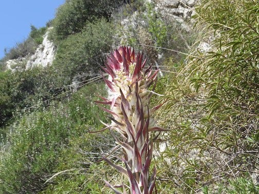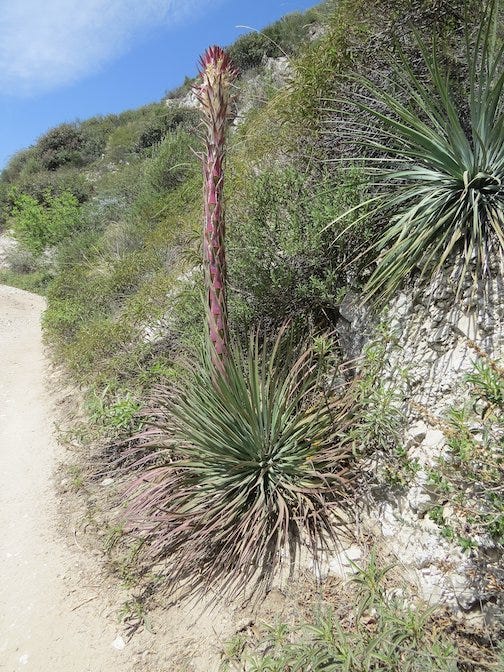 One of my favorite indigenous plants is Yucca whipplei, commonly called, “Our Lord’s Candle,” or “Spanish Bayonet.” (Editor’s note: now renamed by botanists as Hesperoyucca whipplei. ) The Cahuilla call it Panu'ul and the Serrano call it Uumuc. Yucca has many indigenous culinary uses. In the book Temalpakh by Katherine Siva Saubel and Lowell Bean, yucca is described as, “One of the earliest major food plants, this yucca blooms from about April through May in most areas and dies after blooming. Two parts of the plant were used for food: the flower stalk and the blossoms. The flower stalk was said to be at its best just prior to blossoming when it was full of tasty sap.