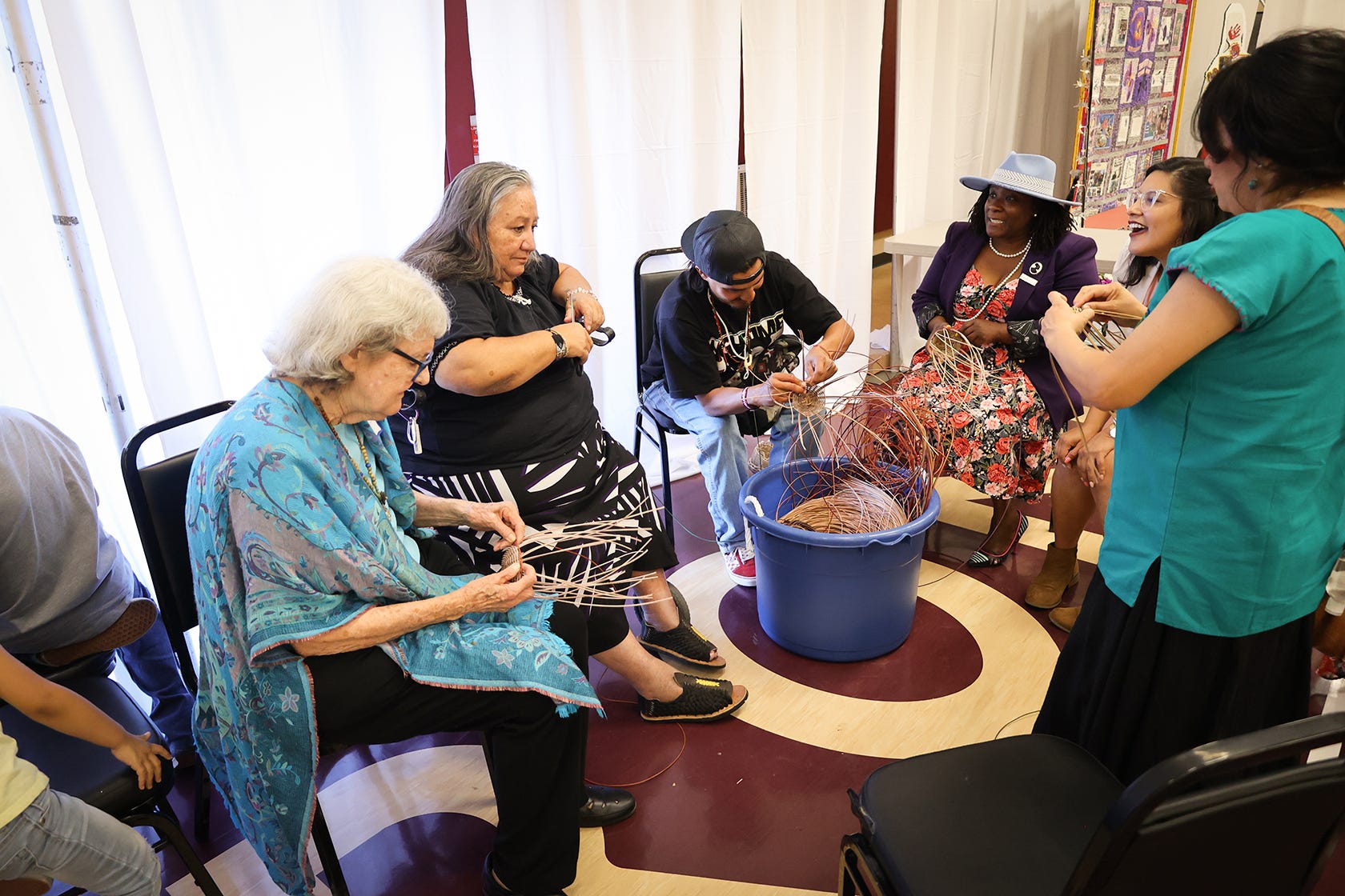 Our Native cultural displays and exhibits were embraced by the large crowd. Here, Lorene Sisquoc, a previous Dragonfly Award winner, shares weaving. Participants made a mini basket “to go.’ (Carlos Puma Photo)